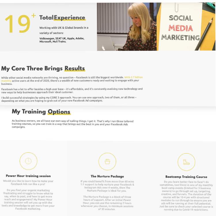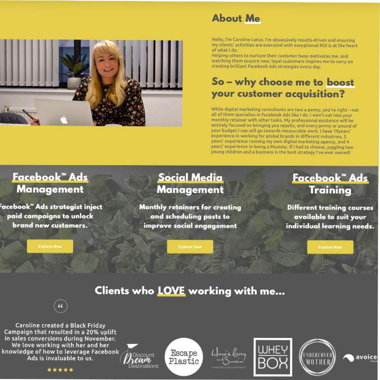This client couldn’t be closer to home… she’s our Managing Director, Caroline Latus! Over the past 4 months, Caroline has entrusted her in-house team to design her website, take charge of her on-site photography, and help to mould her brand tone of voice. Going from heading up a full-service agency to providing Facebook marketing services on her own – Caroline wanted her new branding to reflect her as an individual. And luckily, her very own marketing team knows her pretty darn well! When designing the website, we used a neutral colour palette, `blog type` language, and soft messaging to invite clients for a coffee and a chat, rather than hard & fast conversions.